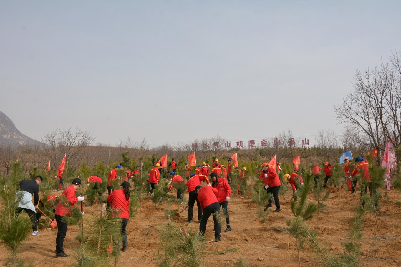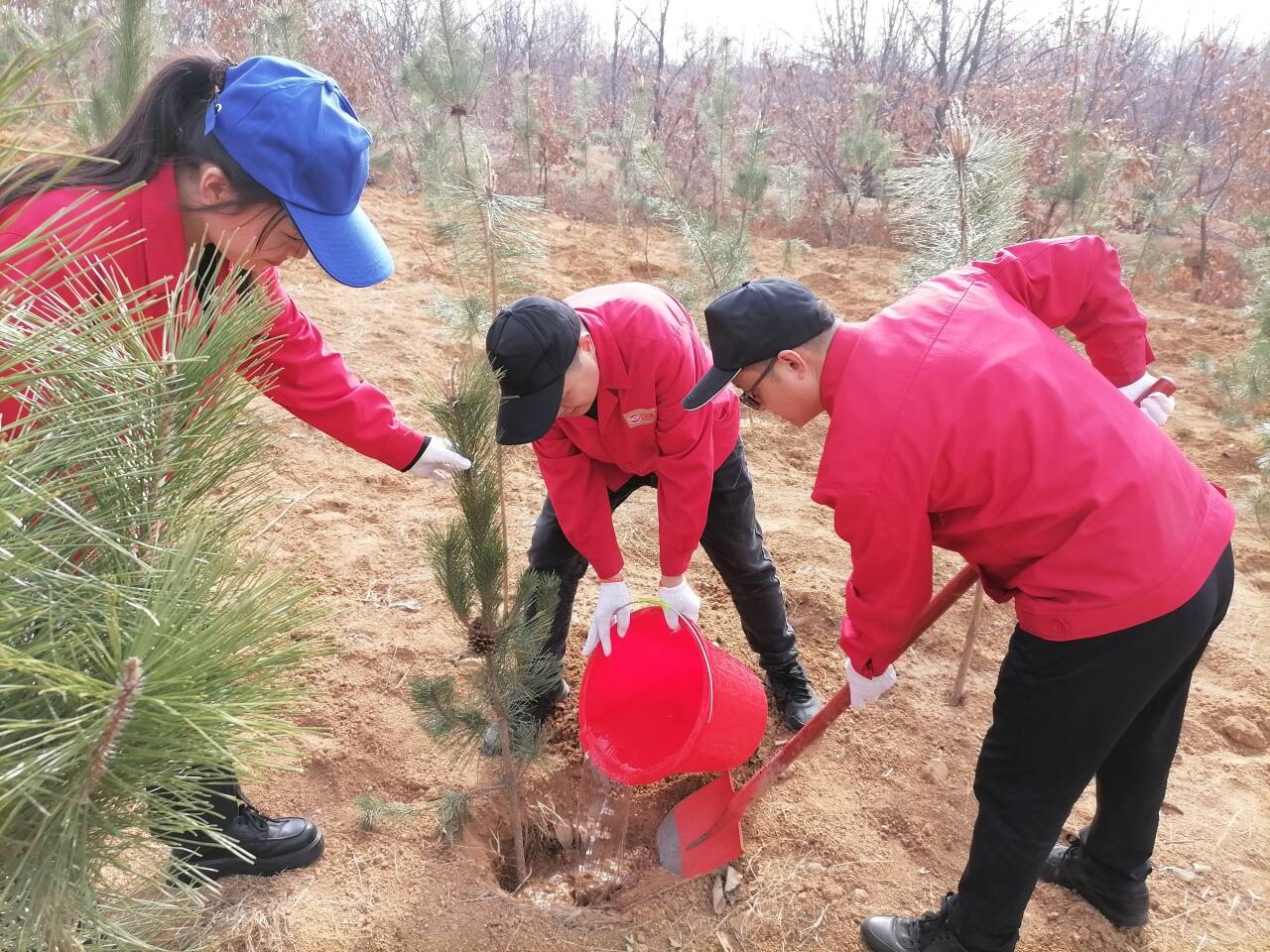 一桶清水,灌溉希望,一棵樹苗,承載未來。植樹現場黨旗、司旗、黨小組旗、團旗在風中迎風飄揚,植樹活動中,大家熱情高漲、干勁十足,全體參加人員發揚不怕苦、不怕臟、不怕累的精神,分工協作、揮鍬鏟土、扶樹填坑、踏土夯苗、提水澆灌,有條不紊地完成植樹各個環節。經過大家一上午的共同努力,一株株新栽種的樹苗迎風挺立,為大地增添了勃勃生機。