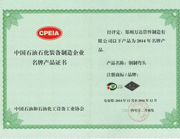 2016/01/28 439 公司益工牌鋼制彎頭被評為2014年中國石油石化裝備制造企業(yè)名牌產(chǎn)品。