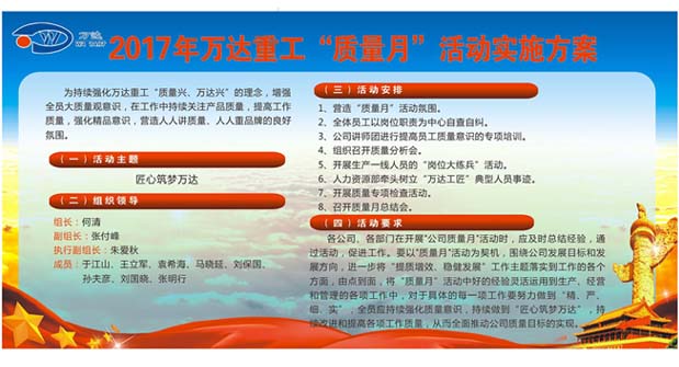 公司于2017年4月1號(hào)---4月30號(hào)舉辦以“匠心筑夢(mèng)萬達(dá)”為主題的質(zhì)量月活動(dòng)。為持續(xù)強(qiáng)化萬達(dá)重工“質(zhì)量興、萬達(dá)興”的理念,增強(qiáng)全員大質(zhì)量觀意識(shí),在工作中持續(xù)關(guān)注產(chǎn)品質(zhì)量,提高工作質(zhì)量,強(qiáng)化精品意識(shí),營(yíng)造人人講質(zhì)量、人人重品牌的良好氛圍,增強(qiáng)企業(yè)凝聚力和市場(chǎng)競(jìng)爭(zhēng)力。