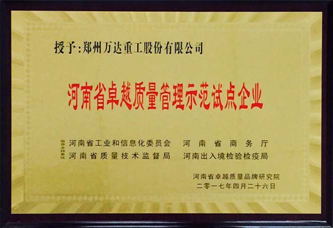 熱烈祝賀鄭州萬達重工股份有限公司榮獲由河南省工業和信息化委員會、河南省商務廳、河南省質量技術監督局及河南出入境檢驗檢疫局等單位共同指導,河南省卓越質量品牌研究院組織評選認定的“河南省卓越質量管理示范試點企業”榮譽稱號。