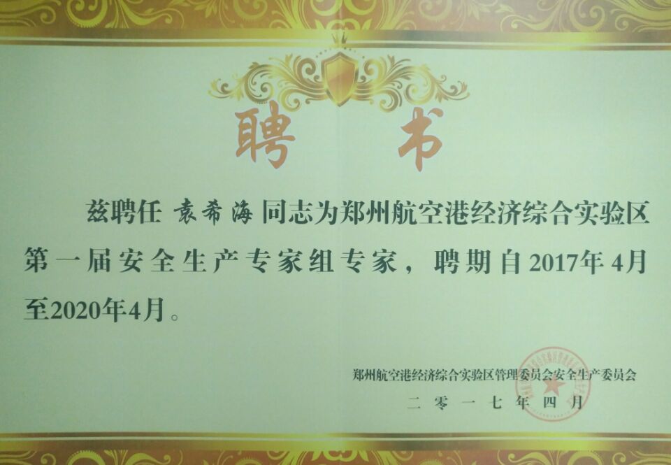 鄭州航空港經濟綜合實驗區管理委員會安全生產委員會辦公室根據《鄭州市安全生產專家組管理辦法》等有關規定,經實驗區安委會辦公室組織推薦、遴選,最終研究確定了第一屆鄭州航空港經濟綜合實驗區安全生產專家組,下設綜合、冶金工貿、危險化學品、職業健康等4個專業組,其中鄭州萬達重工股份有限公司(以下簡稱:萬達重工)總工程師袁希海成為冶金工貿組的安全生產專家。