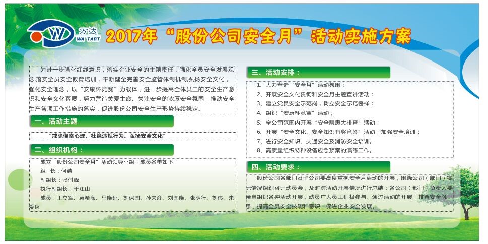 為進(jìn)一步加大安全生產(chǎn)宣傳力度,強(qiáng)化紅線(xiàn)意識(shí),推動(dòng)落實(shí)企業(yè)安全主題責(zé)任,弘揚(yáng)安全文化,強(qiáng)化安全理念,建設(shè)幸福萬(wàn)達(dá)事業(yè),公司特于2017年7月1日—7月31日舉辦以“戒除僥幸心理、杜絕違規(guī)行為、弘揚(yáng)安全文化”為主題的安全月活動(dòng)。