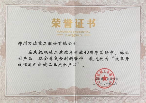 改革開放40周年之際,在中國機械工業聯合會舉辦的“機械工業杰出產品征集及宣傳”活動中,鄭州萬達重工股份有限公司“雙金屬復合材料管件”被選樹為“改革開放40周年機械工業杰出產品”。
