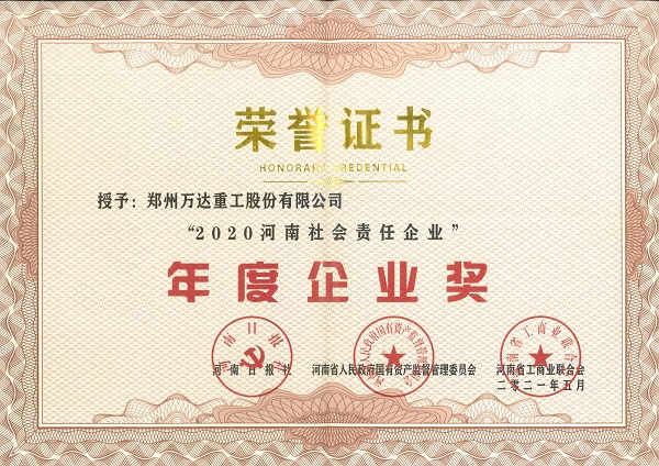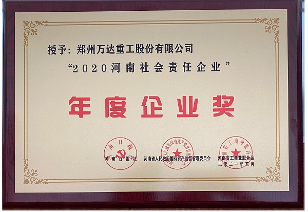 熱烈祝賀鄭州萬達重工股份有限公司榮獲“2020河南社會責任企業(yè)”年度企業(yè)獎