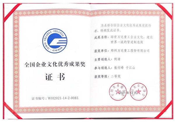 鄭州萬達(dá)重工股份有限公司以系統(tǒng)完善的企業(yè)文化體系及卓有成效的企業(yè)文化實(shí)踐,榮獲“2020-2021年度全國(guó)企業(yè)文化優(yōu)秀成果二等獎(jiǎng)”!