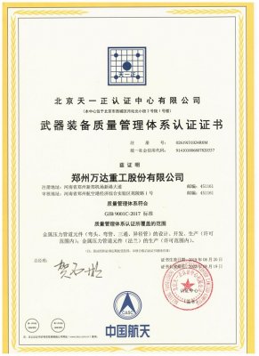 熱烈祝賀鄭州萬達(dá)重工股份有限公司獲得《武器裝備質(zhì)量管理體系認(rèn)證證書》
