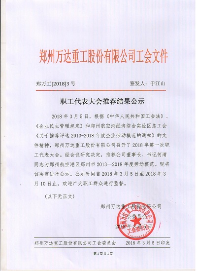 2018/03/08 3297 2018年3月5日,根據(jù)《中華人民共和國工會(huì)法》、《企業(yè)民主管理規(guī)定》和鄭州航空港經(jīng)濟(jì)綜合實(shí)驗(yàn)區(qū)總工會(huì)《關(guān)于推薦評(píng)選2013-2018年度企業(yè)勞動(dòng)模范的通知》的文件精神,鄭州萬達(dá)重工股份有限公司召開了2018年第一次職工代表大會(huì)。經(jīng)會(huì)議研究決定,推薦公司董事長、書記何清同志為鄭州航空港區(qū)鄭州市20132018年度勞動(dòng)模...