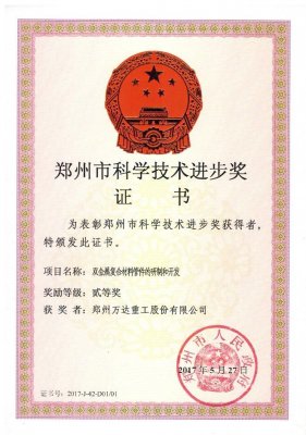 2017/07/19 601 熱烈祝賀鄭州萬達重工股份有限公司雙金屬復合材料管件的研制和開發(fā)項目成果和一種大型匯氣管制作方法發(fā)明專利被鄭州市人民政府分別評選認定為2017年鄭州市科學技術進步獎二等獎和鄭州市專利獎二等獎。 該獎項的獲得是萬達重工依靠技術創(chuàng)新實現(xiàn)轉型升級的成果之一,不僅展現(xiàn)了企業(yè)雙金屬管件和匯氣管產(chǎn)品在國內(nèi)領先的技術水平,還增加了企業(yè)...