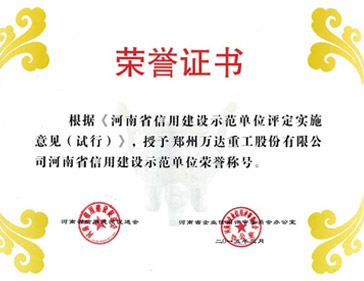2016/01/28 428 熱烈祝賀鄭州萬達重工股份有限公司通過了河南省信用建設促進會和河南省企業信用評審委員會辦公室共同組織的河南省信用建設示范單位復審認證,被認定為河南省信用建設示范單位榮譽稱號!