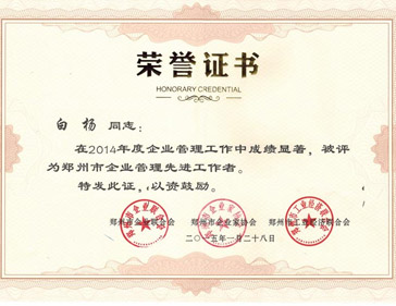 熱烈祝賀我公司白楊同志獲得鄭州市企業管理先進工作者稱號