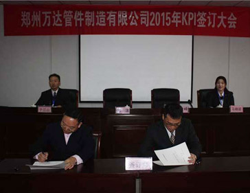 2016/01/28 390 鄭州萬達管件制造有限公司2015年KPI簽訂會于1月30號在公司行政區會議室隆重舉行,公司班長以上所有管理人員參加了此次簽訂會議。簽訂會分為三級簽訂,即:董事長與總經理簽訂、總經理與公司各高管簽訂、公司各高管與分管的各部門負責人簽訂,近期,各部門負責人將部門的KPI指標進行分解,與各班組及相關崗位簽訂目標責任書,達到千...